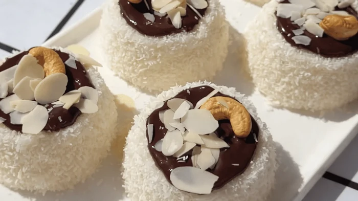 - Ja vēlaties, varat pievienot šokolādi un riekstus, lai piešķirtu saldumiem vairāk bagātības un estētiskuma.