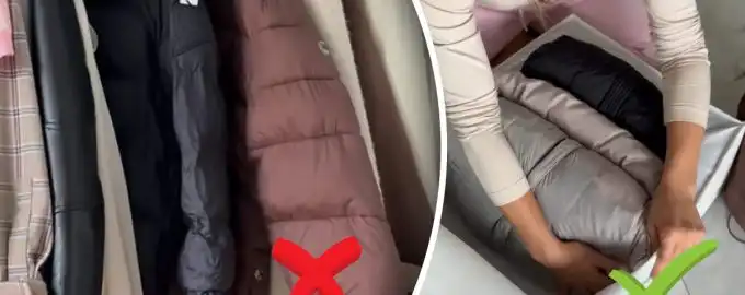 Lai jakas neaizņemtu pusi no skapja, varat izmantot interesantu life hack. Saite nokopēta Kā uzglabāt ziemas jakas / Kolāža: My, foto: ekrānšāviņi no video